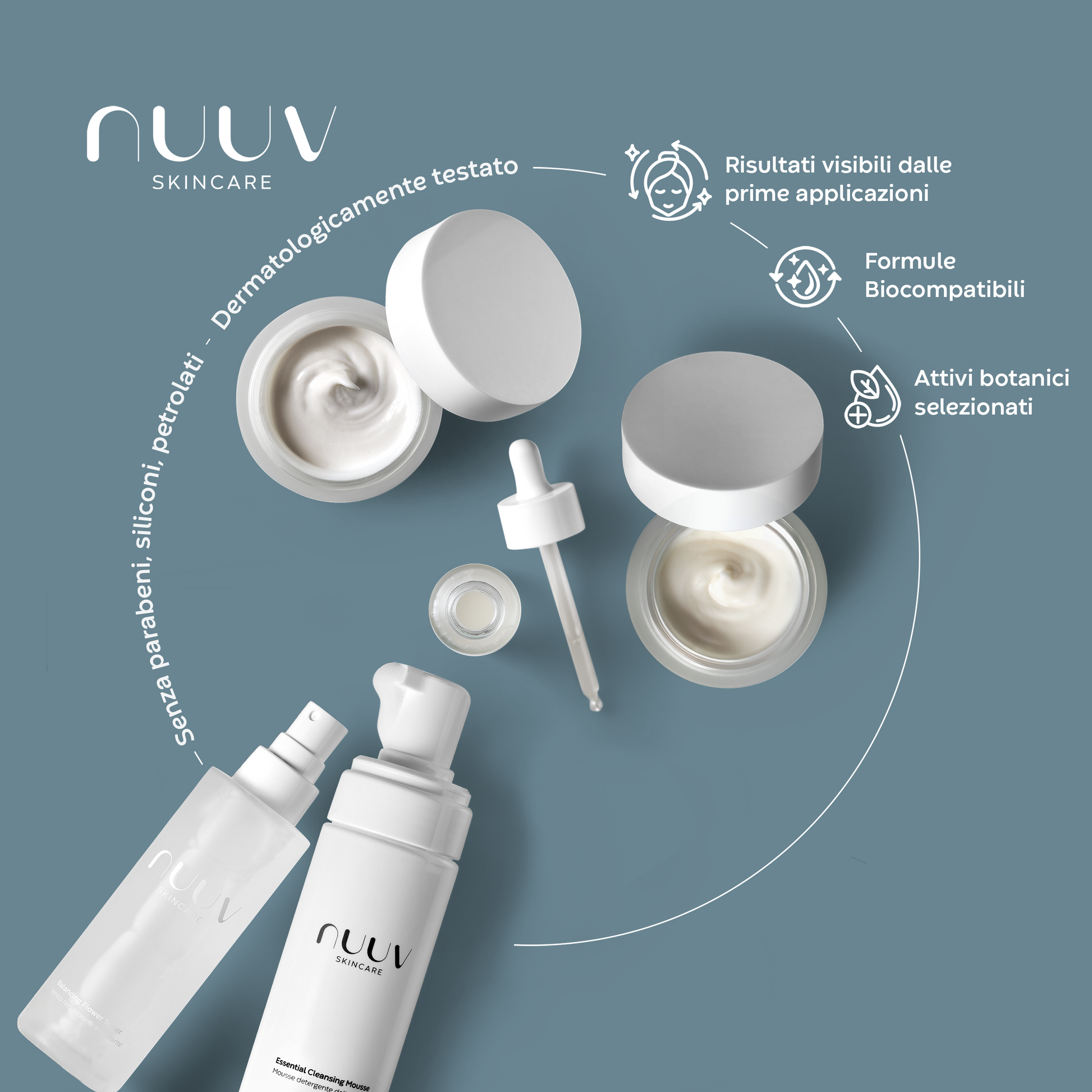 Il primo step è l'Essential Cleansing Mousse, una mousse delicata, arricchita con acque lenitive di aloe e camomilla, che rimuove impurità e sebo, rispettando l'equilibrio cutaneo.