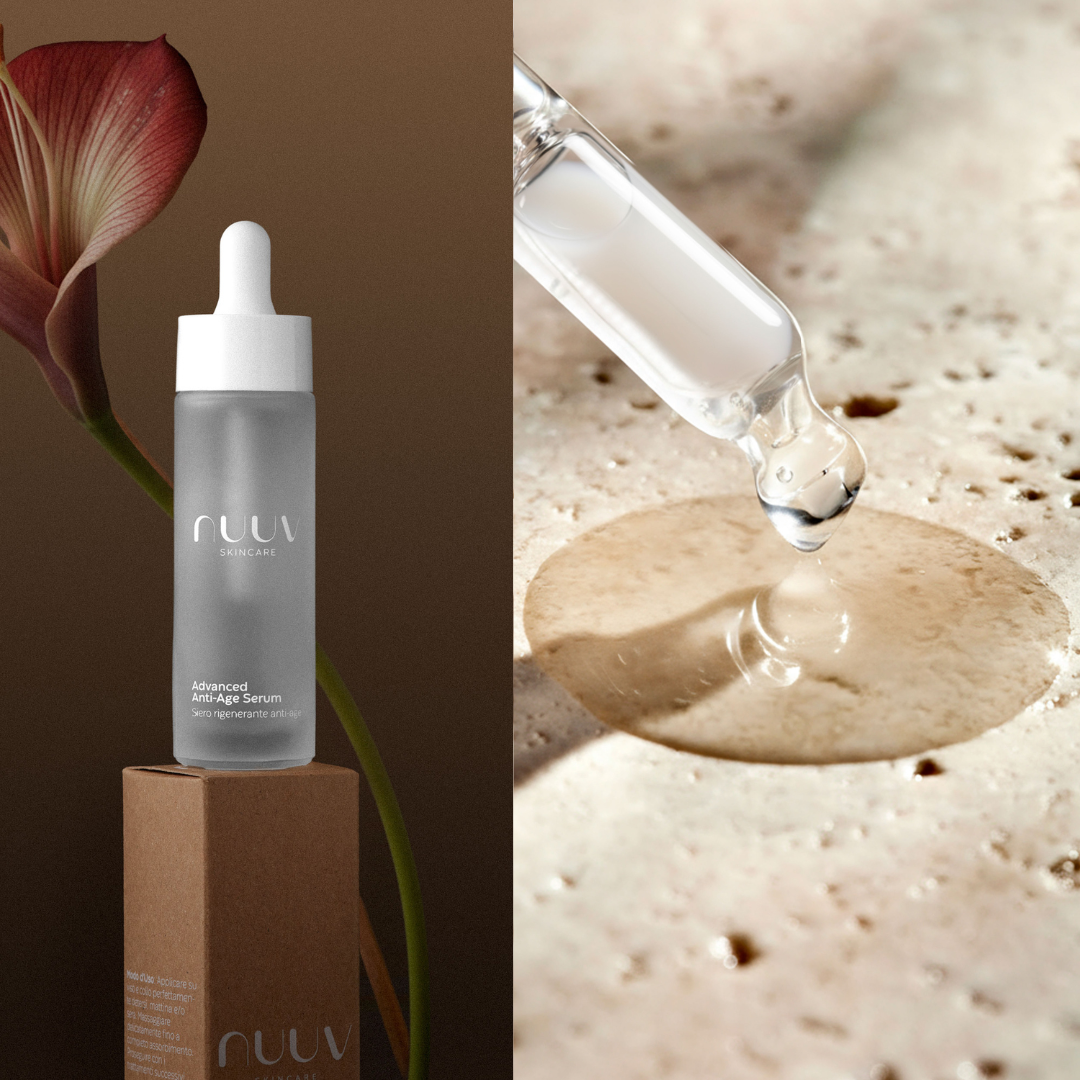 Advanced Anti-Age Serum – siero rigenerante ad assorbimento rapido con peptidi ed esosomi vegetali. Agisce in profondità stimolando collagene e turnover cellulare, migliorando tono, elasticità e uniformità della pelle per un incarnato più compatto e disteso.